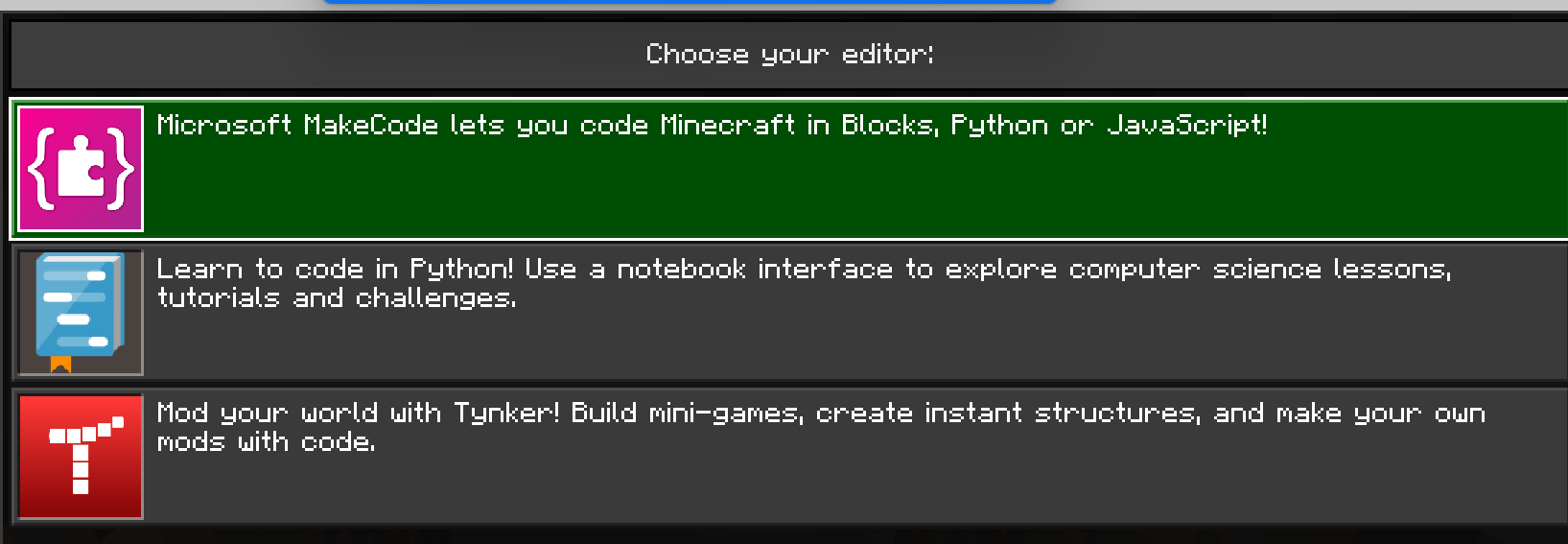 Step 1: In Minecraft press ‘C’ (for code) to enter the code builder and select Microsoft MakeCode