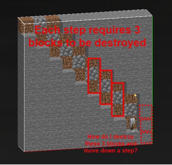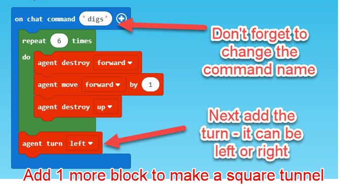 All the good stuff in Minecraft is deep underground so digging tunnels that go down makes total sense. With just 2 extra blocks added to your square tunnel code you can make your tunnel go down 1 block on each corner of your square. Bring some torches to put on each corner! Remember, the agent cannot move through solid blocks – it must destroy (hint) a block first and then move down before it digs the next tunnel.
