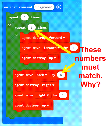 In the bonus code below you will recognise the ‘repeat 6’ block contains the original ‘dig’ command code. Afterwards the agent moves backwards 6 steps then destroys the block to the right, moves right and repeats the tunnel again. If we do this 4 times (using the ‘repeat 4’ block) we get a 6×4 block room.